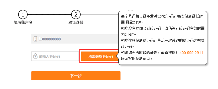 第二步:验证身份。点击页面中的”点击获取验证码“,手机查收验证码并完成填写,进入”下一步“: