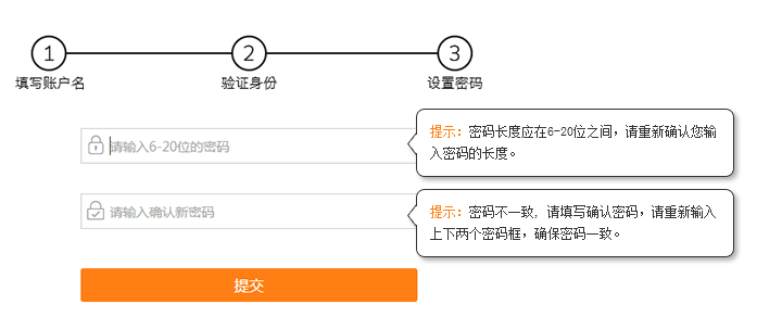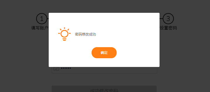 第三步:设置密码。重复输入新密码,并提交。显示”修改密码成功“即完成密码找回。系统会自动跳转到登陆界面,请输入账号与新设置的密码进行登陆。
